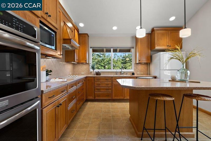 - Dishwasher, Double Oven, Microwave, Range, Refrigerator, Self Cleaning Oven, Dryer, Washer, 220 Volt Outlet, Counter - Solid Surface, Eat-in Kitchen, Kitchen Island, Range/Oven Built-in, Self-Cleaning Oven