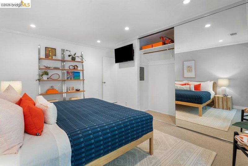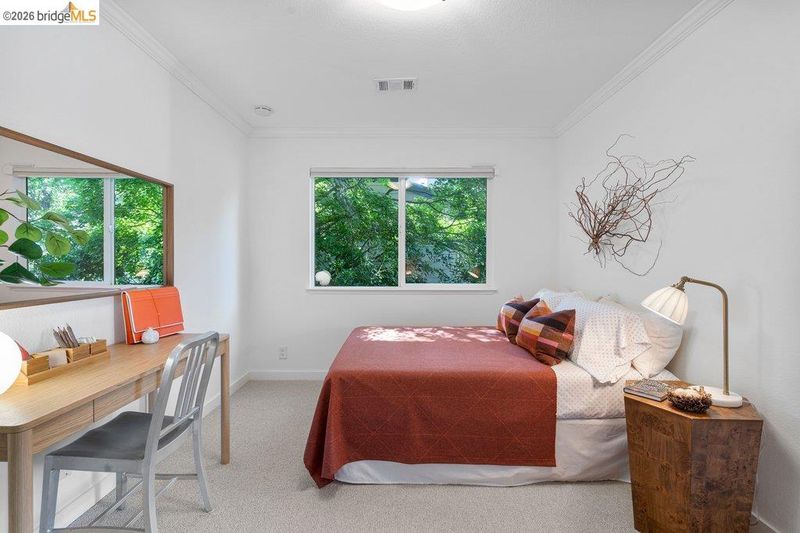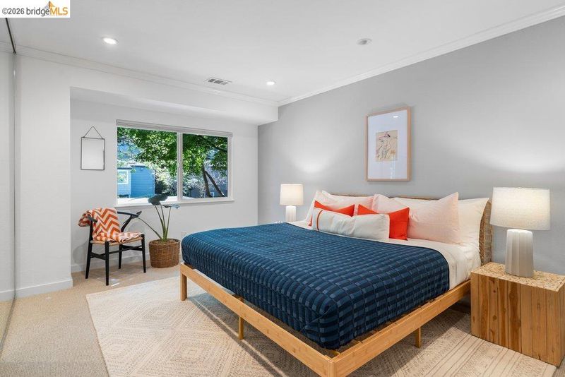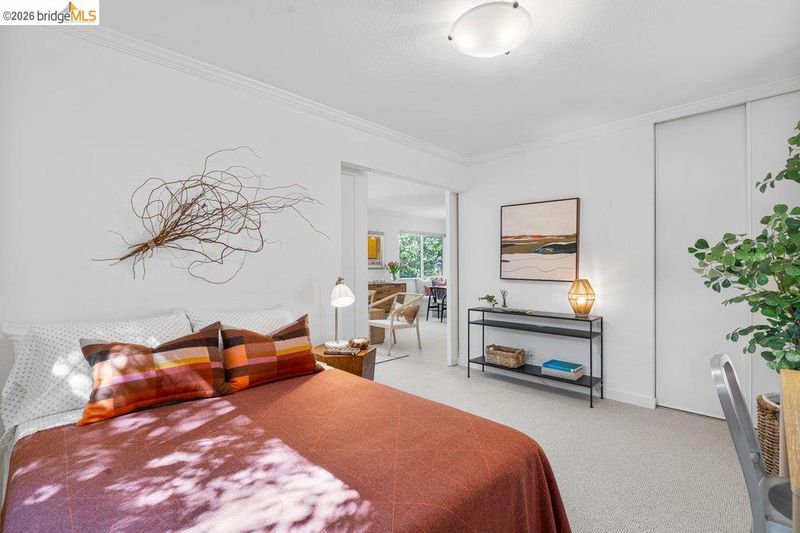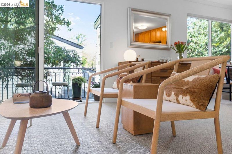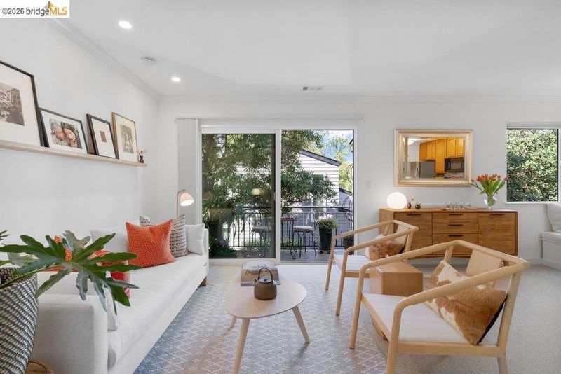 Serene, refined, and nestled in a leafy, greenbelt setting, this glowing upper corner condo is the gold standard for tranquil living. The airy interior sparkles with large windows and green outlooks wherever you turn, including a private deck dappled with natural light. Birdsong might be the only sound you hear throughout the day in your personal cocoon. Thoughtful, customized updates include a luxe laundry/storage area, built-in dining seating, recessed lighting, new wool carpeting, and pull-out flat screen TVs, making this one of the premium units in this coveted, tree-lined complex. Smart floor plan features a large primary bedroom, open kitchen-dining space with custom built-in storage benches, a living room draped in afternoon sunlight with level-out access to the intimate deck, and a second bedroom that doubles nicely as a home office. Beautiful, well-tended grounds. Situated within arm's reach of city amenities, transportation, commuter buses, large employers, bakeries, cafes and pubs, this core location represents convenience plus nature, privacy plus community, in a polished elegant space that spells "home”. Don't miss the direct pathway to Emeryville Community Center with gym, pickleball courts and swimming pool, and the HOA clubhouse available for parties and events!