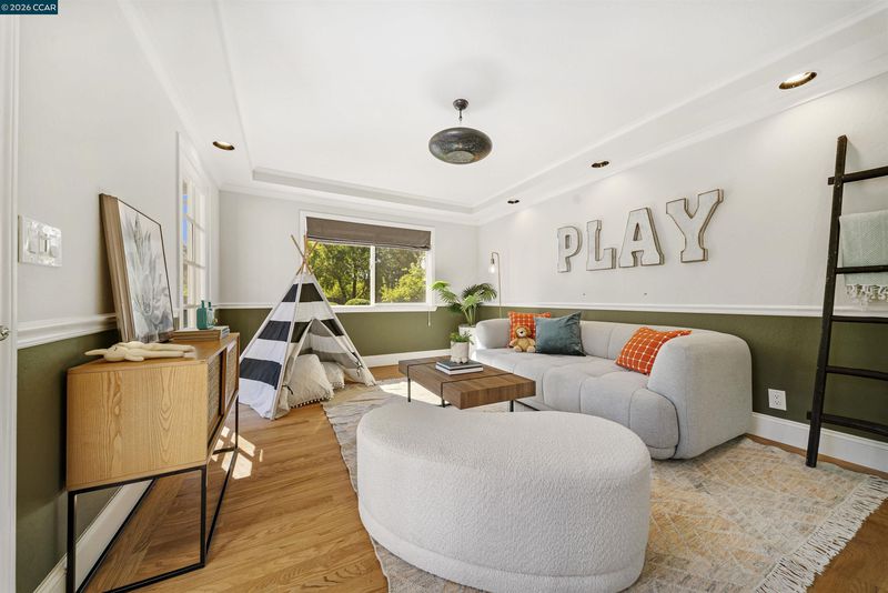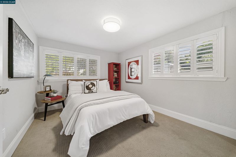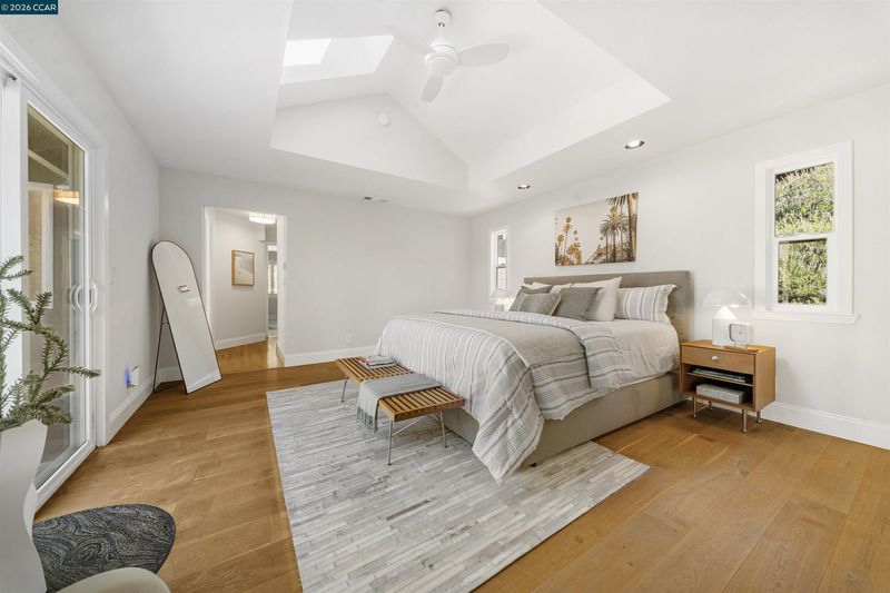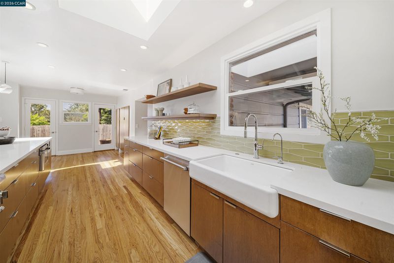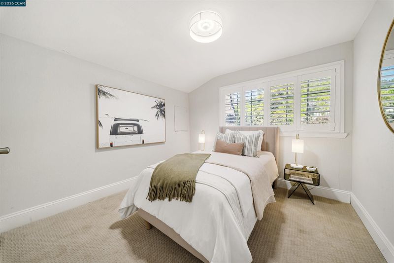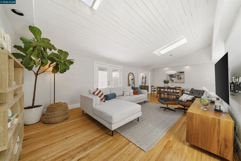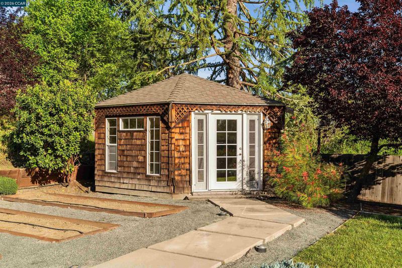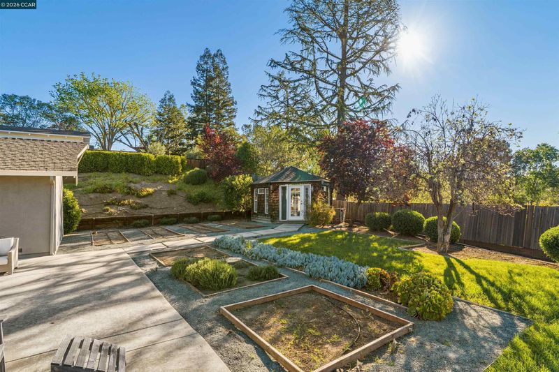 Welcome to this charming single story home in the sought-after Cameo neighborhood w/ stunning hill views. You're greeted by refinished hardwood floors that flow throughout. The oversized living room features a shiplap vaulted ceiling, skylights, dining area, & access outside to the patio. Adjacent to the dining area, the sunken family room has a tray ceiling & access to the backyard. The remodeled kitchen features quartz countertops, Heath Tile backsplash, modern open shelving, soft-close cabinetry, breakfast bar, deep farmhouse sink w/ instant hot water & stainless steel appliances (Thermador 6-burner range). Find 2 front-facing bedrooms w/ plantation shutters, flex bonus space, & laundry room w/ built-in storage & folding station. The left wing has a remodeled hall bath w/ modern finishes, a junior suite w/ an en-suite bathroom & the primary bedroom w/ vaulted ceilings, dual mirrored closets, a large walk-in closet w/ built-ins, doors that open to the backyard & an ensuite bathroom w/ soaking tub & stall shower. The backyard has a spacious patio, lush lawn, garden beds, & an outbuilding equipped w/ electricity & heat/air. The oversized stone driveway leads to a tandem 2-car garage w/ EV charger. This home is conveniently located near top-rated schools, trails, & freeway access.