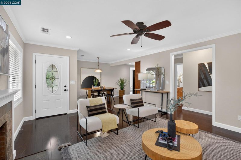 Welcome home to this beautifully maintained 4br/2ba ranch-style home with no steps to the entry on a huge thoughtfully landscaped lot in a very desirable neighborhood. Step inside to a spacious living area with wood floors, a cozy fireplace, and recessed lighting. The floor plan flows naturally into a dining area and a generously sized kitchen. Kitchen features many cabinets, granite countertops w/tile backsplash and is equipped with stainless steel refrigerator, gas stove, microwave, and dishwasher. The large primary suite with a large tile shower, luxury plank vinyl and a wall of closet space easily accommodates a king-size bed. Three additional bedrooms are well-sized with large closets and new carpet. The second bathroom features a tub with shower overhead. Conveniently located laundry and mud room near sliding door to the backyard. Special features include energy-efficient dual-pane windows, central HVAC, ceiling fans, recessed lighting, paneled interior doors and crown molding. Freshly painted and move-in ready!