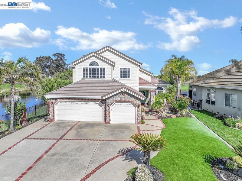 Stunning Discovery Bay Country Club custom home with sweeping water and golf course views overlooking the 1st fairway. Situated on a private corner lot, this 4BD/3.5BA residence includes a desirable ground-floor en-suite. The chef’s kitchen features stainless steel appliances, granite countertops, walk-in pantry, breakfast bar, wine fridge, and ample cabinetry. The family room offers a stone-accented gas/wood-burning fireplace and opens to the backyard for seamless indoor-outdoor living. The spacious primary suite includes a sitting area with dual-sided fireplace, spa-like bath with dual vanities, walk-in closet, and breathtaking sunrise and fairway views. The backyard is designed for entertaining with a built-in fireplace, patio seating, BBQ area, and lush landscaping. Oversized 3-car garage with custom cabinetry and workspace. Exceptional home offering luxury, comfort, and incredible views.